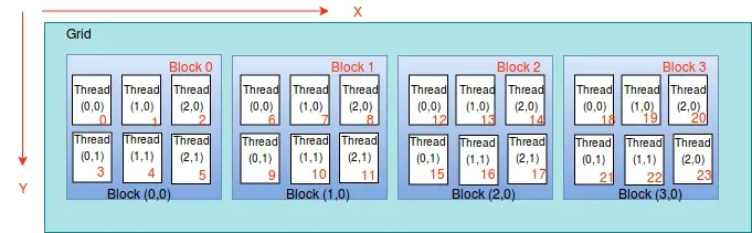 threadId=grid 内 block 的线性编号blockId×每个 block 的线程总数threadsPerBlock+block 内 thread 的线性编号localThreadId