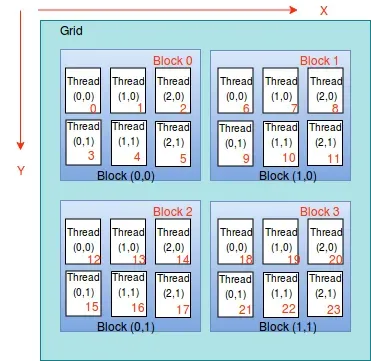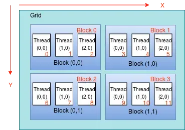threadId=(blockIdx.x×blockDim.x×blockDim.y)+(threadIdx.y×blockDim.x)+threadIdx.x