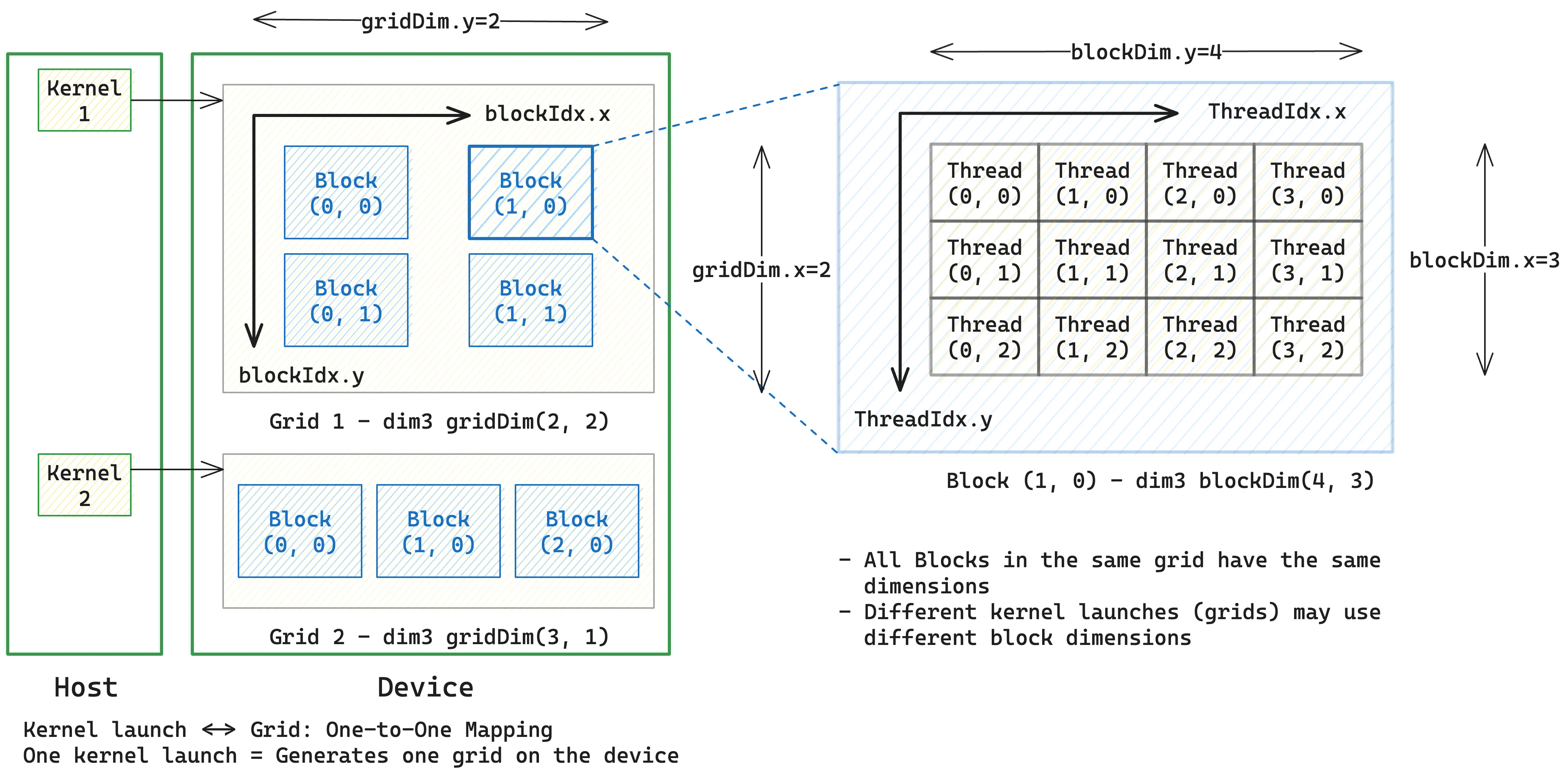 - 不同的 kernel launch 可以使用不同的 grid 维度和 block 维度。