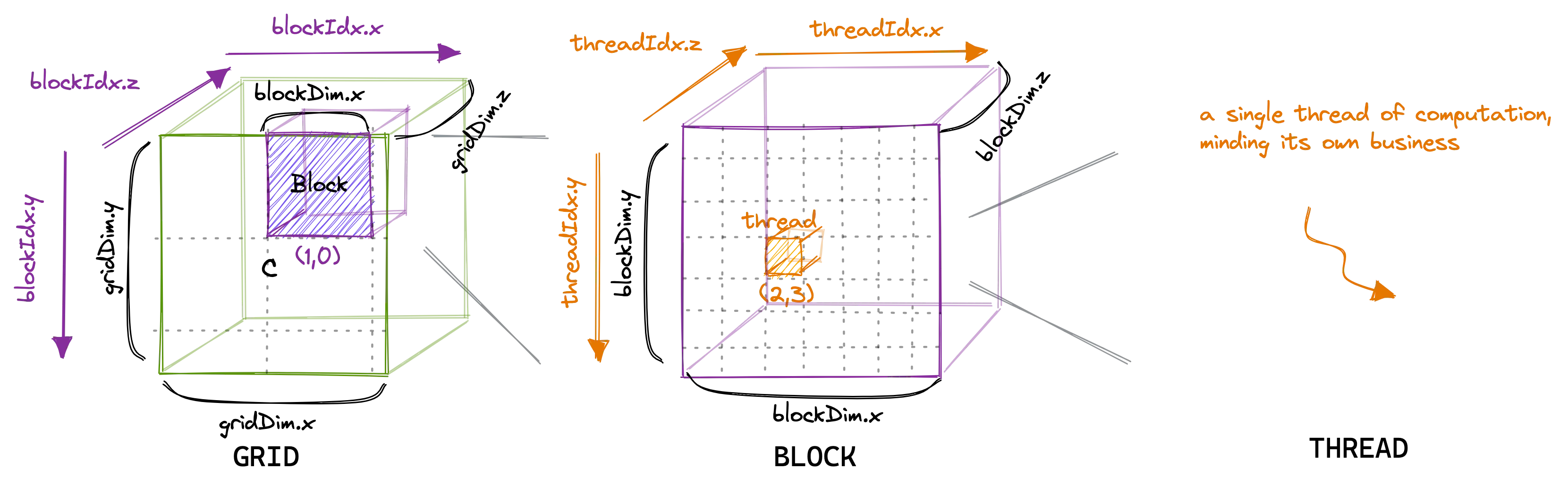 本文简单介绍了在 CUDA 环境下 Grid, Block 和 Thread 的概念,以及如何寻找它们的地址。