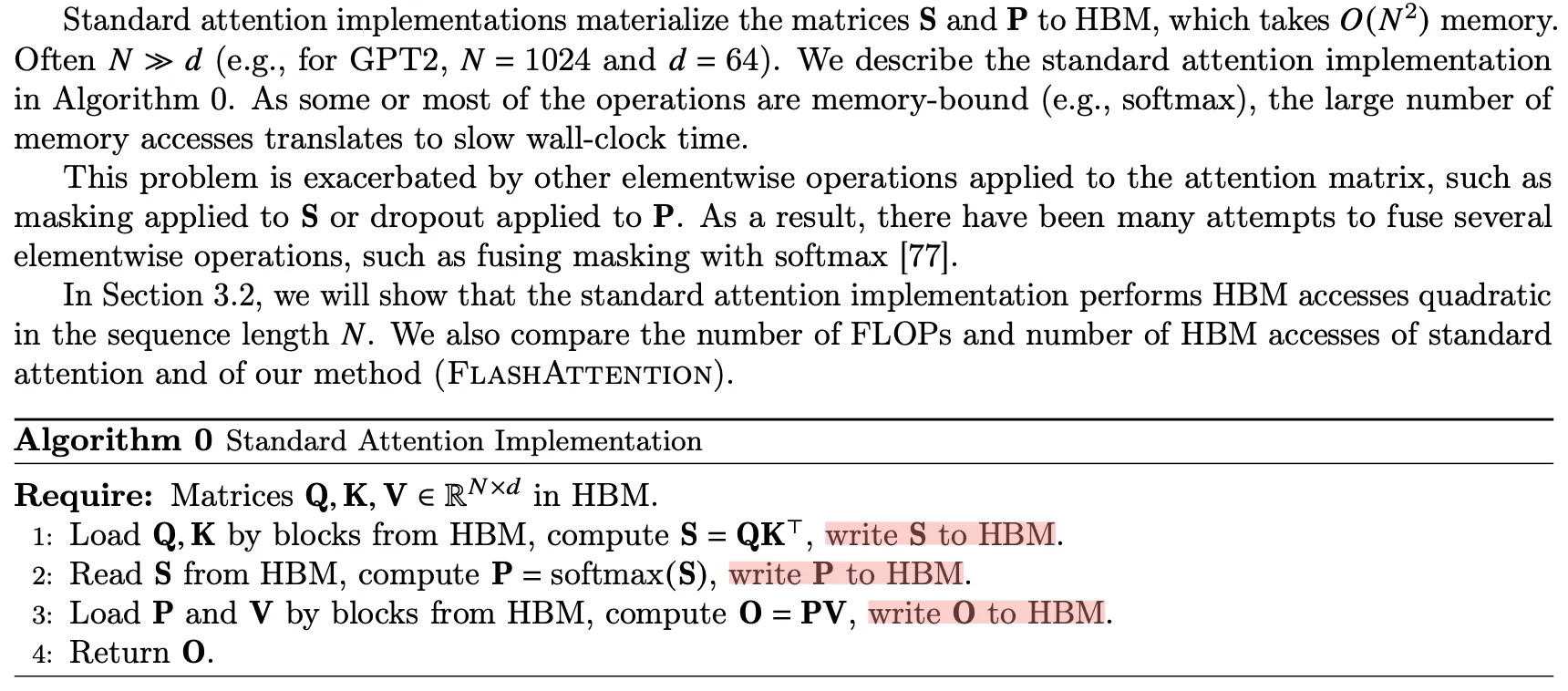 - 标准 Attention 需要显式构造中间矩阵(如 S=QK⊤ 和 P=softmax(S)),其规模为 N×N