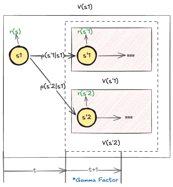 V(s)=E[GtSt=s]=E[Rt+γ(Rt+1+γRt+2+γ2Rt+3+)St=s]=E[Rt+γGt+1St=s]=E[RtSt=s]+γst+1SE[Gt+1St+1=st+1]P(St+1=st+1St=st)=r(s)+γsSV(s)p(ss)\begin{align} V(s) &= \mathbb{E}[G_{t}|S_{t}= s] \\ &= \mathbb{E}[R_{t}+ \gamma (R_{t+1}+ \gamma R_{t+2}+\gamma^2R_{t+3}+\dots)|S_{t}=s] \\ &= \mathbb{E}[R_{t}+\gamma G_{t+1}|S_{t}=s] \\ &= \mathbb{E}[R_{t}|S_{t}=s] + \gamma \sum_{s_{t+1}\in \mathcal{S}}\mathbb{E}[G_{t+1}|S_{t+1}=s_{t+1}] \mathbb{P}(S_{t+1}=s_{t+1}| S_{t}=s_{t}) \\ &= r(s) + \gamma \sum_{s' \in \mathcal{S}} V(s') p(s'|s) \end{align}
