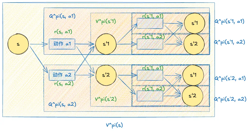 这些公式可以直接从图中直观观察到,本质上是概率乘以对应奖励加权求和。
