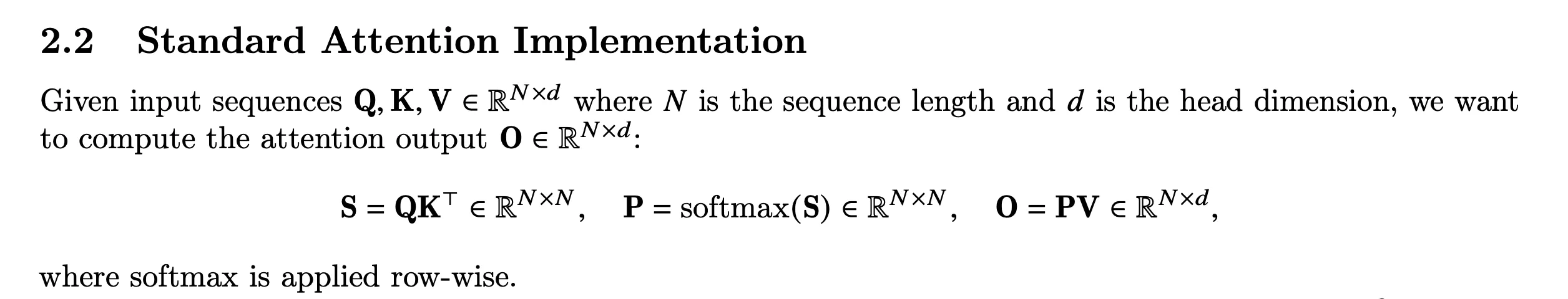 - 标准 Attention 需要显式构造中间矩阵(如 S=QK⊤ 和 P=softmax(S)),其规模为 N×N